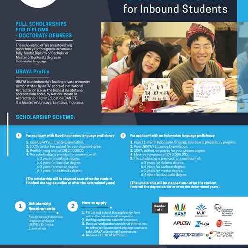 The University of Surabaya (UBAYA) International Scholarship includes the following: