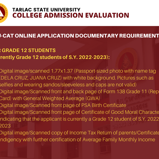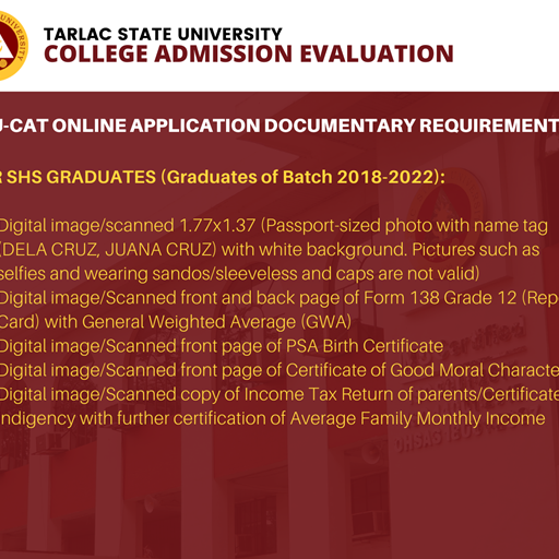 Application and uploading of requirements will only be online via https://cat.tsu.edu.ph every Monday to Friday from 7:00 AM to 6:00 PM.
