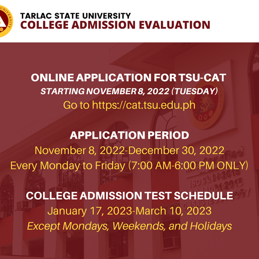 The online application for the Tarlac State University College Admission Evaluation or TSU-CAE will start on November 8, 2022 (Tuesday) until December 30, 2022 (Friday).