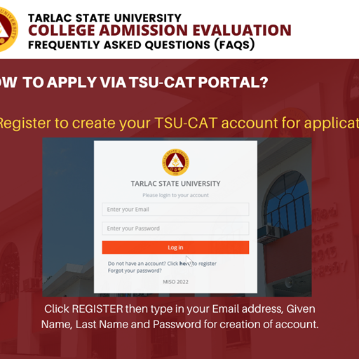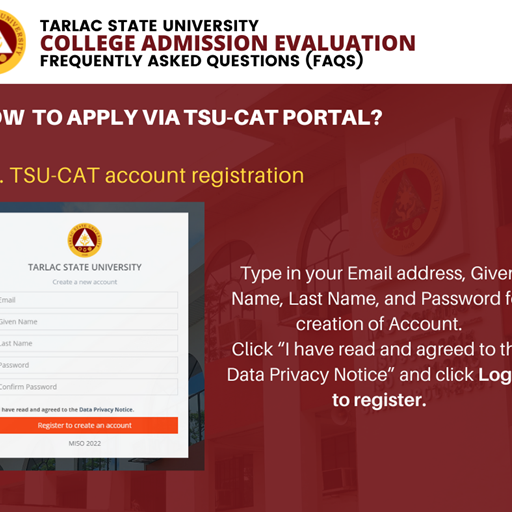 Go to https://cat.tsu.edu.ph, click GET STARTED, and log in to your TSU CAT account or click REGISTER to create an account.