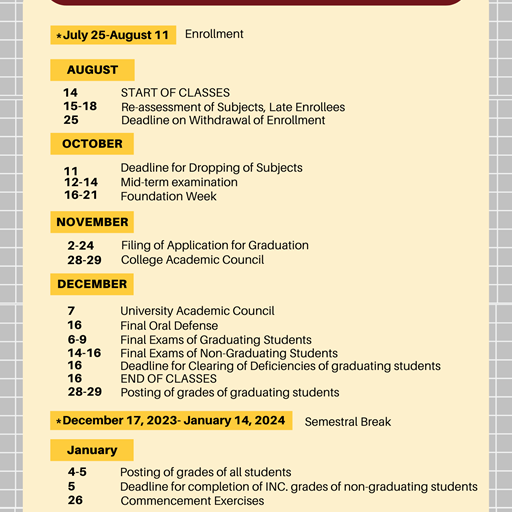 Other details are available on the uploaded social media card. The collegiate academic calendar for the upcoming 1st semester is also attached for everyone's reference.