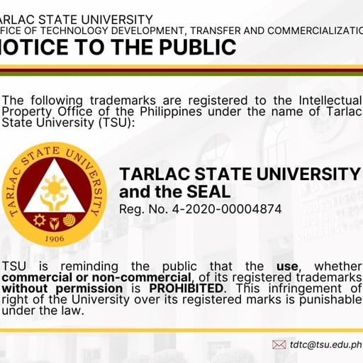 The following trademarks are registered to the Intellectual Property Office of the Philippines under the name of TARLAC STATE UNIVERSITY (TSU):
