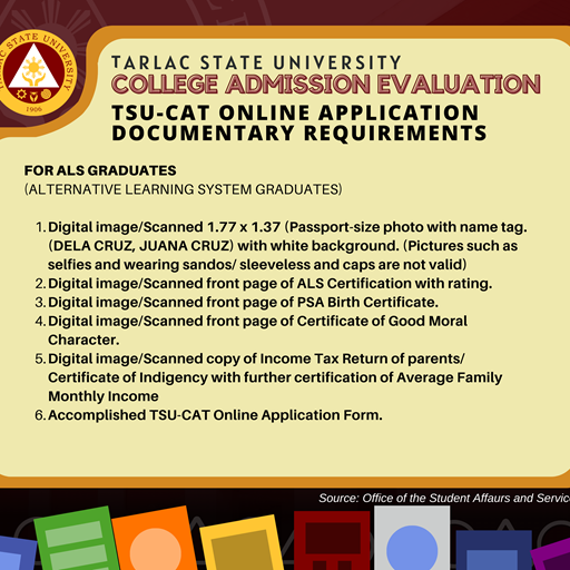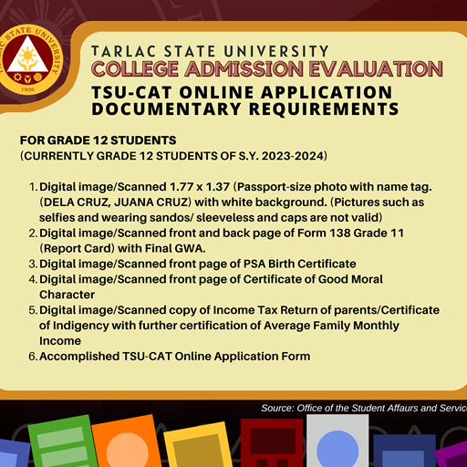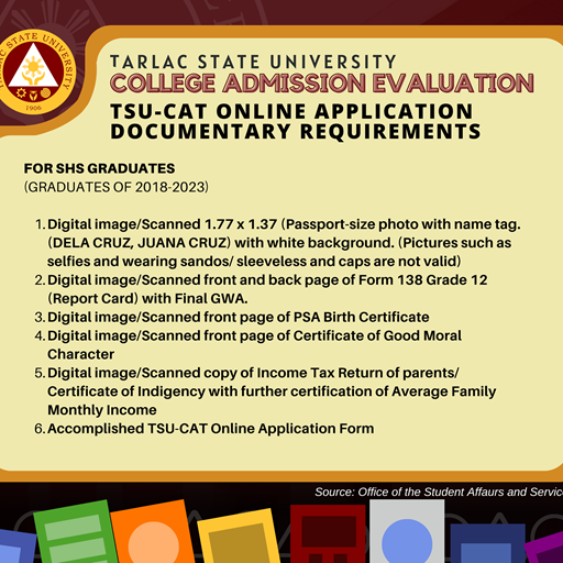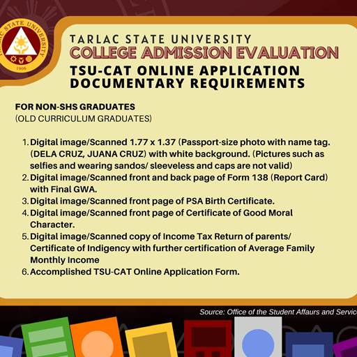 Application and uploading of requirements will only be online via https://cat.tsu.edu.ph every Monday to Friday from 7:00 AM to 6:00 PM.