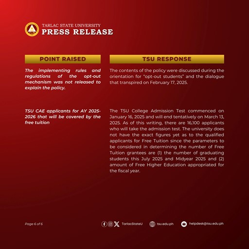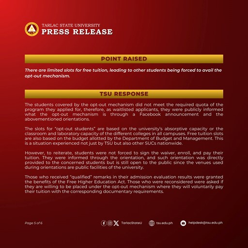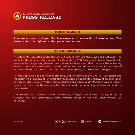 For the past and current semesters, these students and their parents signed a waiver without duress or coercion, which was subsequently notarized. The university's legal counsel reviewed this waiver. Tarlac State University, as a state-run institution, recognizes that it will never be acceptable to force students to sign a waiver and enroll under the opt-out mechanism.