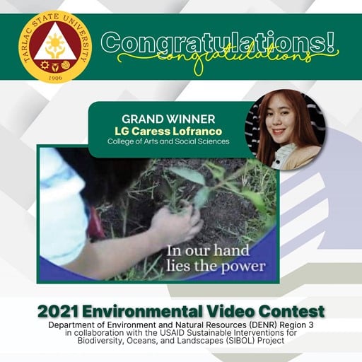 LG Caress Lofranco of the College of Arts and Social Sciences and Maria Angela Dancel of the College of Science in the Environmental Video Contest of the Department of Environment and Natural Resources (DENR) Region 3 - in collaboration with the USAID Sustainable Interventions for Biodiversity, Oceans, and Landscapes (SIBOL) Project.