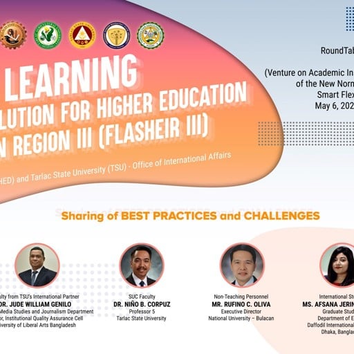 To ensure continuous partnerships among higher education institutions in Region III to address flexible learning concerns towards becoming a smart and resilient academic community, Tarlac State University organized a roundtable discussion in cooperation with the Commission on Higher Education and the TSU Office of International Affairs held today (May 6) via Zoom and Facebook Live.